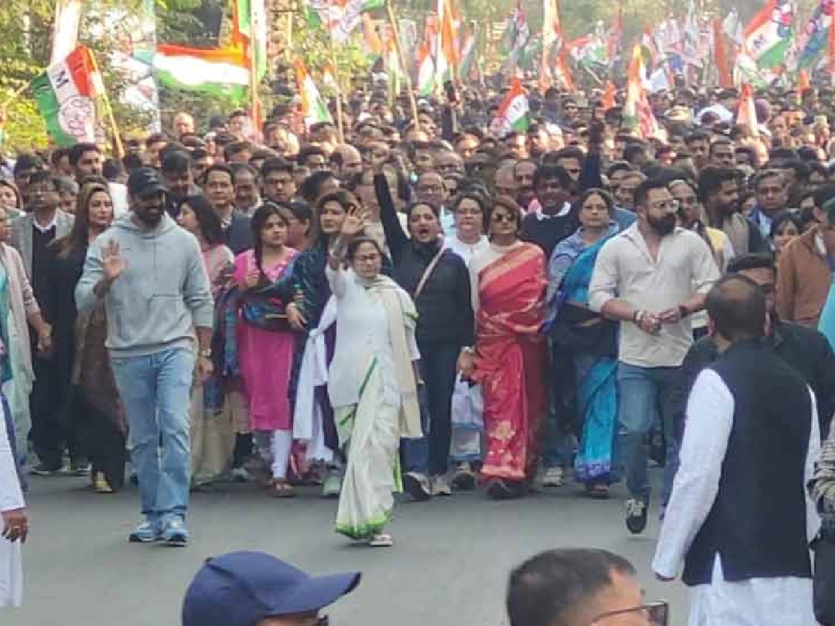 এদিন মিছিলে গ্ল্যামার দুনিয়ার উপস্থিতিও ছিল নজরকাড়া। মমতার পাশেই পা মেলাতে দেখা গিয়েছে: