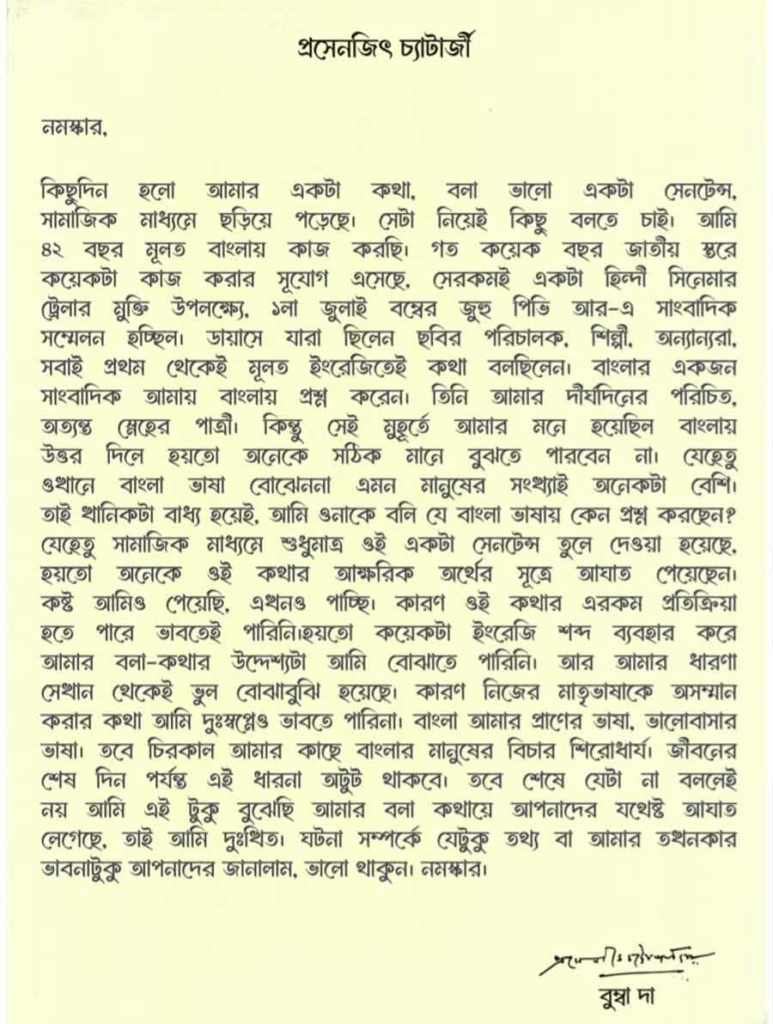 এদিন সোশাল মিডিয়ায় পোস্টে অভিনেতা লেখেন, “আমি ৪২ বছর মূলত বাংলায় কাজ করছি। গত কয়েক বছর জাতীয় স্তরে কয়েকটা কাজ করার সুযোগ এসেছে। সেরকমই একটা হিন্দি ছবির ট্রেলার মুক্তি উপলক্ষে মুম্বইয়ের সাংবাদিক সম্মেলন হচ্ছিল। ডায়াসে যাঁরা উপস্থিত ছিলেন তাঁরা প্রত্যেকেই ইংরেজিতে কথা বলছিলেন। অনেকেই সেখানে বাংলা বোঝেন না। বাংলার একজন সাংবাদিক আমায় বাংলায় প্রশ্ন করেন। তিনি আমার দীর্ঘদিনের পরিচিত, অত্যন্ত স্নেহের পাত্রী। কিন্তু আমার সেই মুহূর্তে মনে হয়েছিল বাংলায় উত্তর দিলে হয়তো অনেকে সঠিক মানে বুঝতে পারবেন না।যেহেতু ওখানে বাংলা ভাষা বোঝেন না এমন মানুষের সংখ্যাই অনেক বেশি তাই এই মন্তব্য করেছিলাম। আমার এই কথায় অনেকে আঘাত পেয়েছেন। আমিও পেয়েছি। আমার কথা ভুলভাবে পৌঁছেছে সকলের কাছে।”