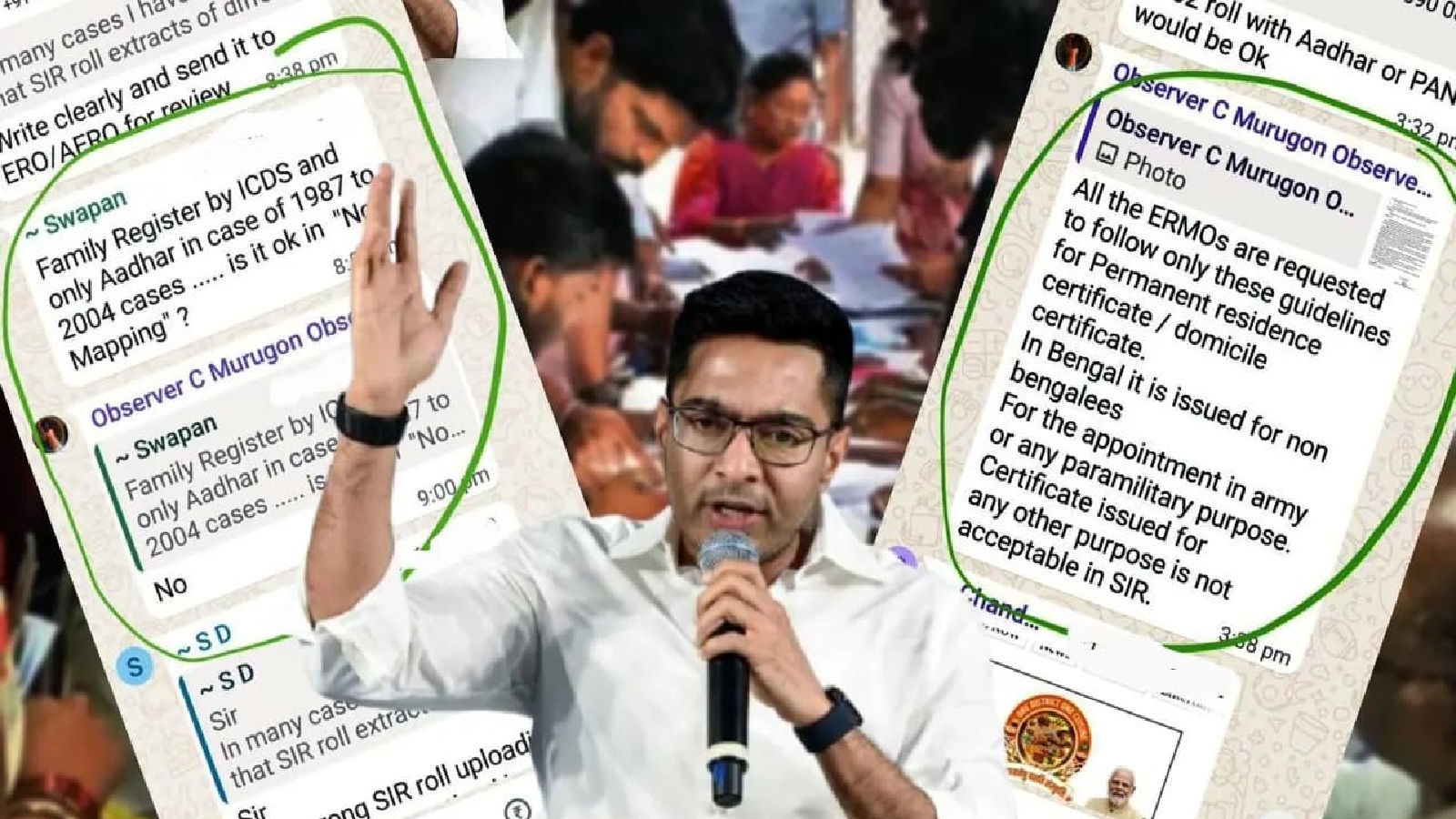 অভিষেকের পোস্ট করা স্ক্রিনশটগুলিতে দেখা যাচ্ছে, ‘ইআরএমও সাউথ ২৪ পরগনা’ নামক একটি গ্রুপে মাইক্রো অবজারভারদের জন্ম শংসাপত্রের গ্রহণযোগ্যতা নিয়ে নির্দেশ দিচ্ছেন জনৈক ‘অবজারভার চিমা মুরুগান’।